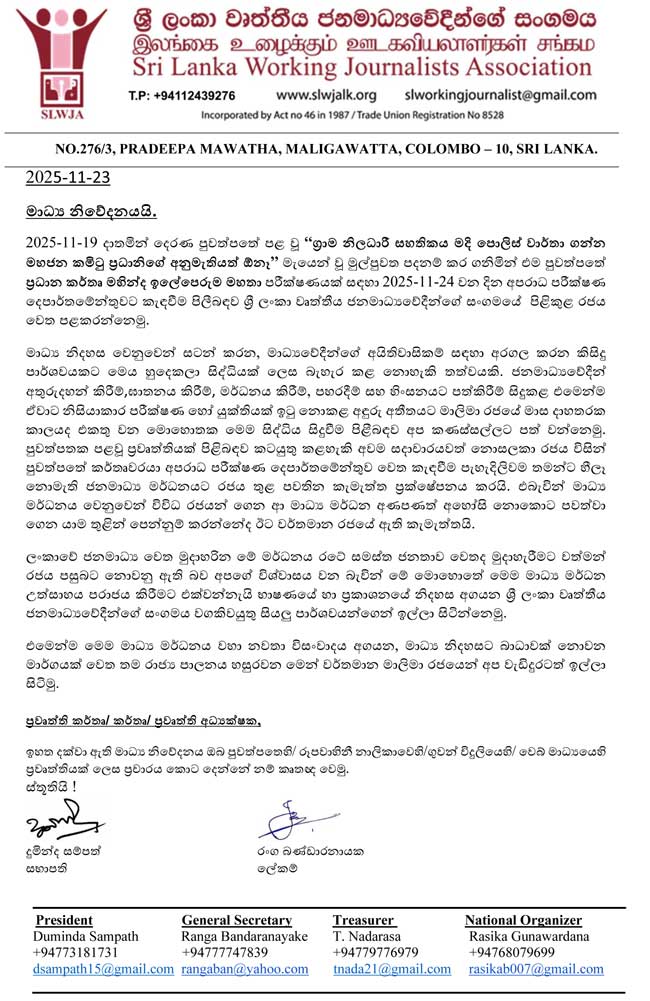 මාධ්‍ය මර්දන උත්සාහය පරාජය කිරීමට එක්වන්නැයි ශ්‍රී ලංකා වෘත්තීය ජනමාධ්‍යවේදීන්ගේ සංගමය ඉල්ලයි