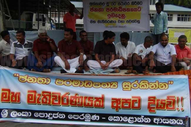 "අපි උපන් රට ඕනමයි රැක ගන්නට, ඒක විකුනන්නට එපා ඔබ මිය ගියත් දෙන්නට, වහාම පාර්ලිමේන්තු මැතිවරණයක් කැදවනු, අපිට ඕන මැතිවරණයක්, එ.ජා.ප ජේ.වී.පී. හවුල පරදමු" වැනි විරෝධතා වැකි කියමින් කොළොන්න නගරය හරහා කොලොන්න ප්රාදේශීය සභාව අසලට පැමිණ මන්ත්රීවරුන් සත්යග්රහයක් සඳහා වාඩි විය.