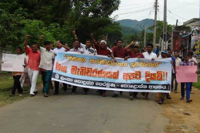 විරෝධතාකරුවන් විවිධ සටන් පාඨ කියමින් ඇඹිලිපිටිය සූරියකන්ද මාර්ගයේ කොළොන්න නගරයට විරෝධතා පා ගමනින් පැමිණෙන ලදී.