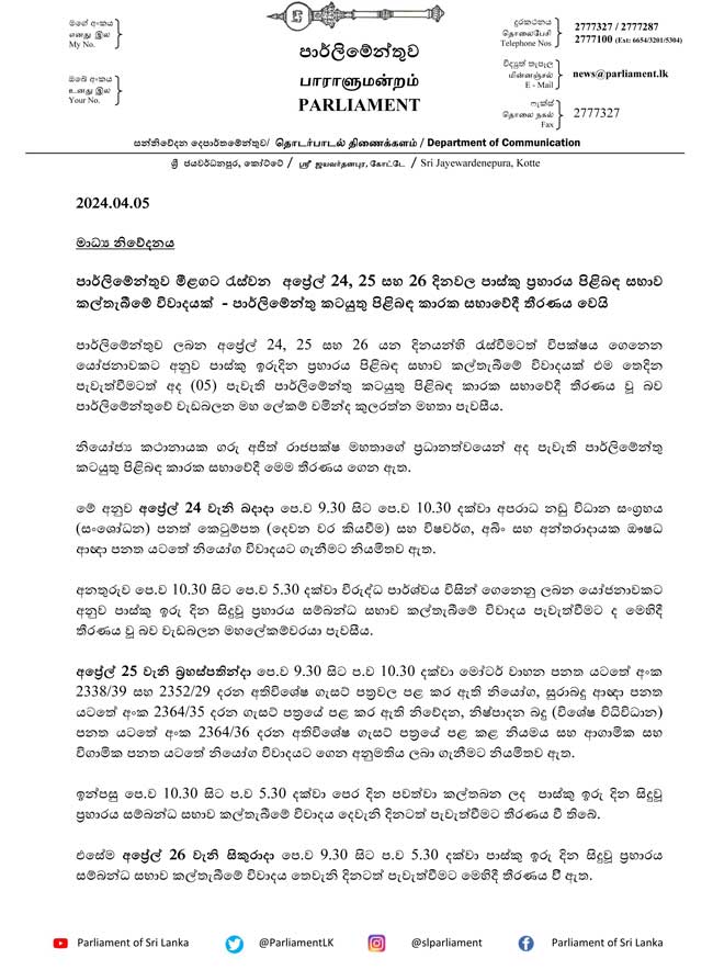 පාස්කු ප්රහාරය සම්බන්ධයෙන් සභාව කල්තැබීමේ විවාදයක් අප්රේල් 24, 25 හා 26 යන තෙදින පුරා පැවැත්වීමට පාර්ලිමේන්තු කටයුතු පිළිබඳ කාරක සභාවේදී තීරණය වී තිබේ.