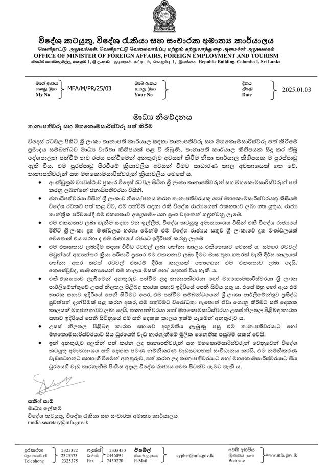 තානාපතිවරු සහ මහකොමසාරිස්වරු පත්කිරීම සම්බන්ධයෙන් විදේශ කටයුතු අමාත්යාංශය නිවේදනයක් නිකුත් කර තිබේ.