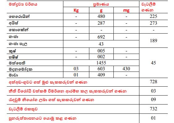 මෙහෙයුම මගින් හෙරොයින් හා අයිස් මත්ද්රව්ය සම්බන්ධ වැටලීම් 498ක් සිදුකර ඇති අතර හෙරොයින් හා අයිස් මත්ද්රව්ය ග්රෑම් 767ක් පොලිස් භාරයට ගෙන තිබේ.