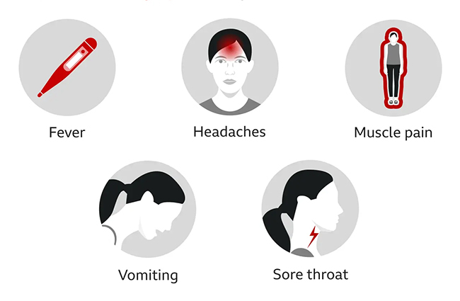 මෙහි මූලික රෝග ලක්ෂණ අතර උණ, හිසරදය, මාංශ පේශි වේදනාව, වමනය සහ උගුරේ අමාරුව ඇතුළත් විය හැකිය.