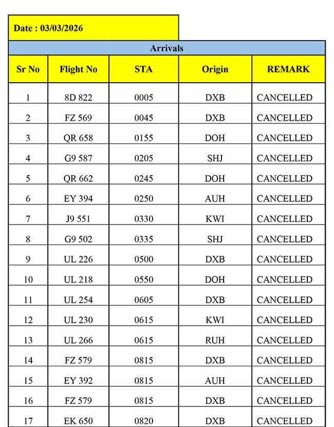 අවංලංගු වූ ගුවන් ගමන් පිළිබඳ තොරතුරු පහතින් දැක්වේ.