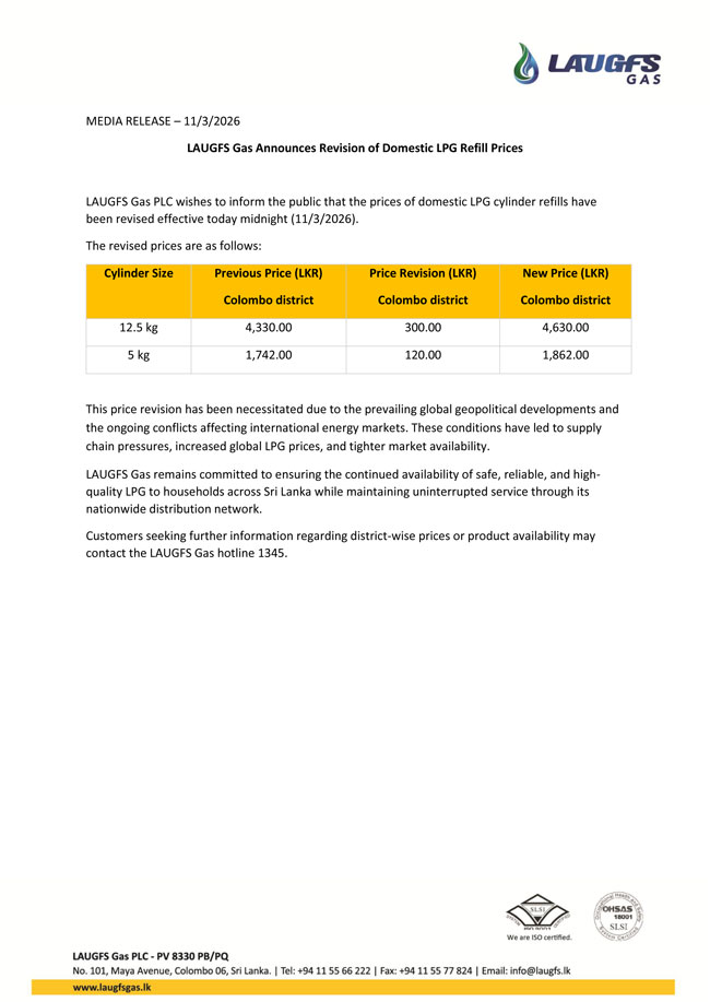 අද (11) මධ්යම රාත්රියේ සිට ක්රියාත්මක වන පරිදි ලාෆ්ස් ගෑස් මිල ඉහළ දමා තිබේ.